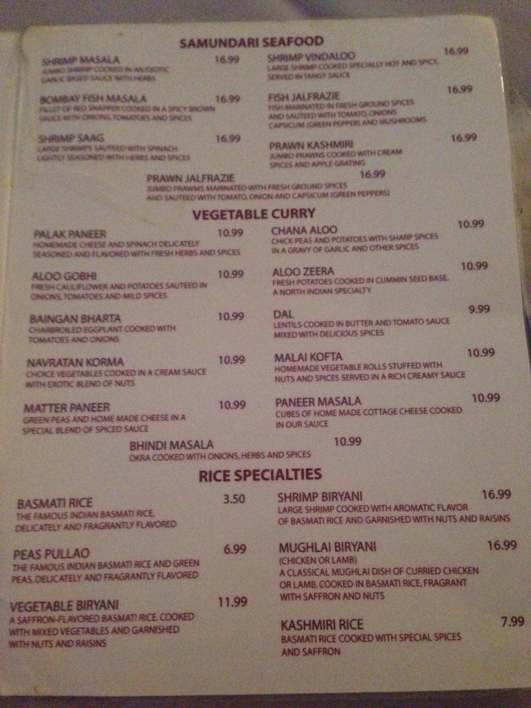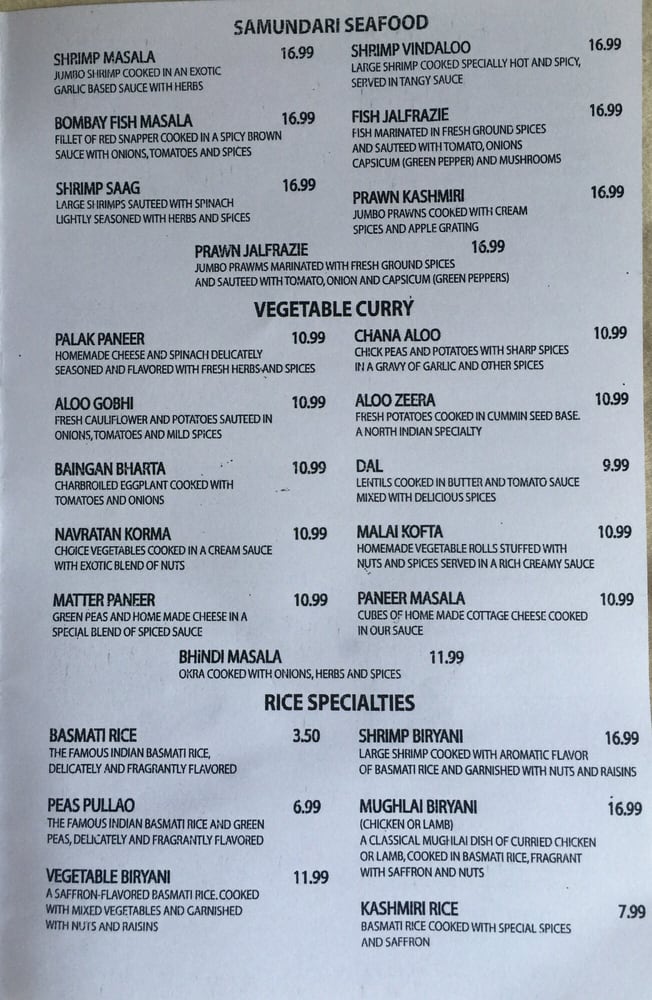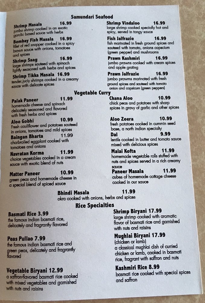 The heartwarming Chicken Curry selection features dishes like Chicken Korma and Chicken Vindaloo, ensuring every bite transports you straight to India. Seafood lovers can indulge in the Samundari Seafood collection, showcasing dishes such as Bombay Fish Masala and Shrimp Vindaloo, all bursting with fresh flavors and aromatic spices.